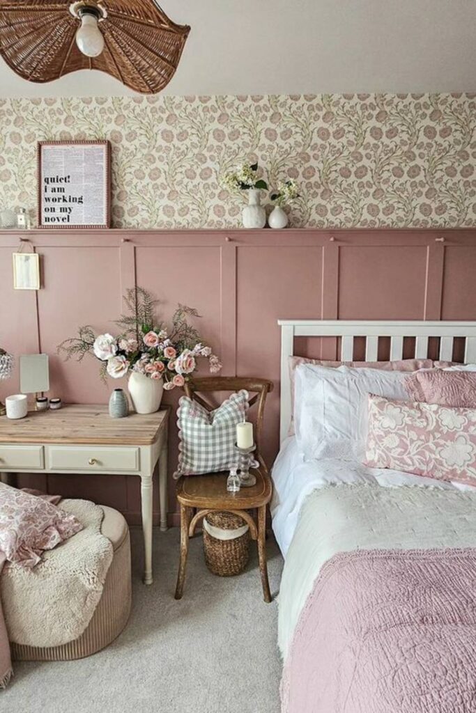 Start with textured wallpaper featuring floral designs on the upper wall, paired with wainscoting or paneling in a matching pink shade for a timeless appeal.