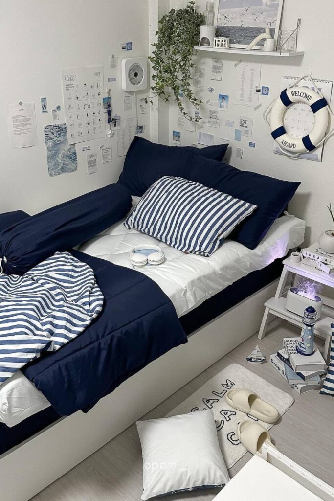 Turn your bedroom into a nautical paradise with navy blue and white striped bedding and coastal-inspired decor. Decorate the walls with lifebuoys or framed beach photos to enhance the theme.