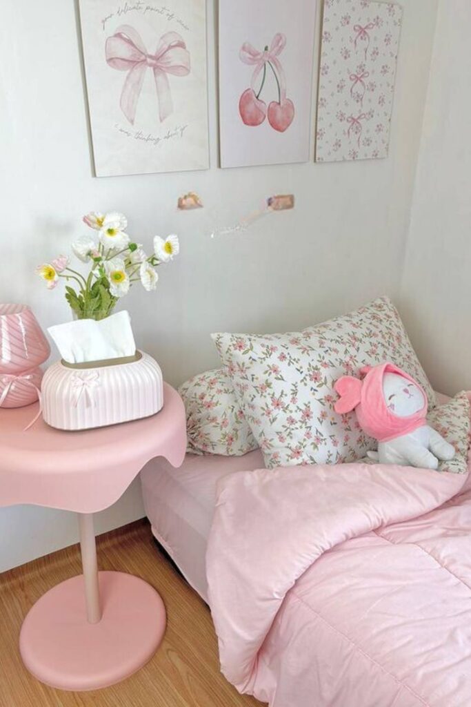 Enhance the room’s delicate aesthetic with framed art in soft tones. Choose floral-patterned bedding to match, creating a feminine and cozy vibe.
