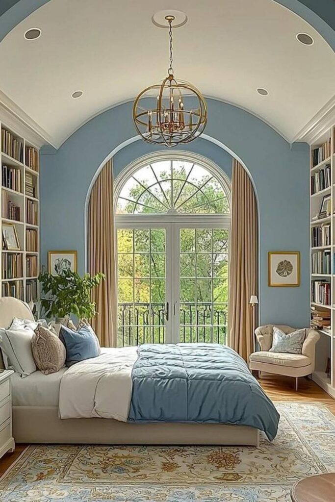 Transform your bedroom into a cozy book nook by adding built-in bookshelves on both sides of your bed. Paint the room in soft pastel shades like blue for a calm, relaxing vibe.