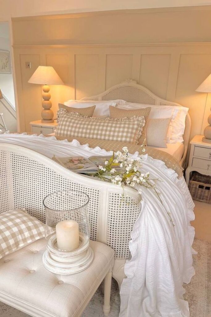 Create a Cottagecore bedroom setup with soothing beige tones, gingham pillows, and charming floral arrangements.