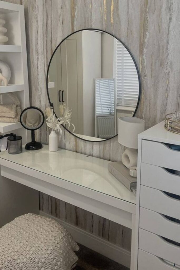 Craft a minimalist vanity space with a sleek, white vanity desk and a large, round mirror above it for a streamlined look. Arrange skincare and perfumes on a tray to maintain organization.