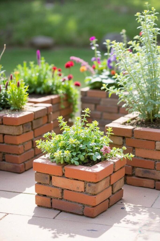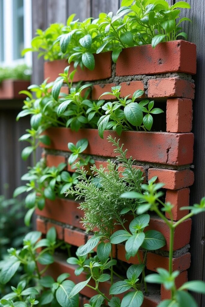Maximize space with a vertical herb garden made from bricks, ideal for small areas. Stack the bricks with intentional gaps where you can plant herbs like basil, thyme, and rosemary.