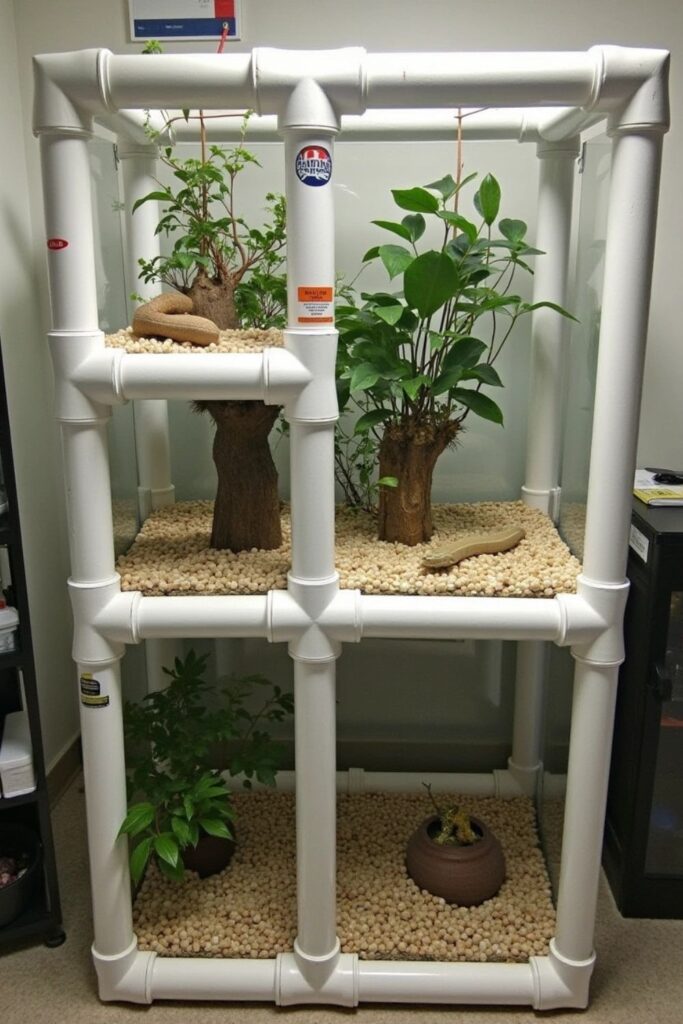 Create a vertical wonderland by constructing a multi-tiered enclosure with PVC piping.