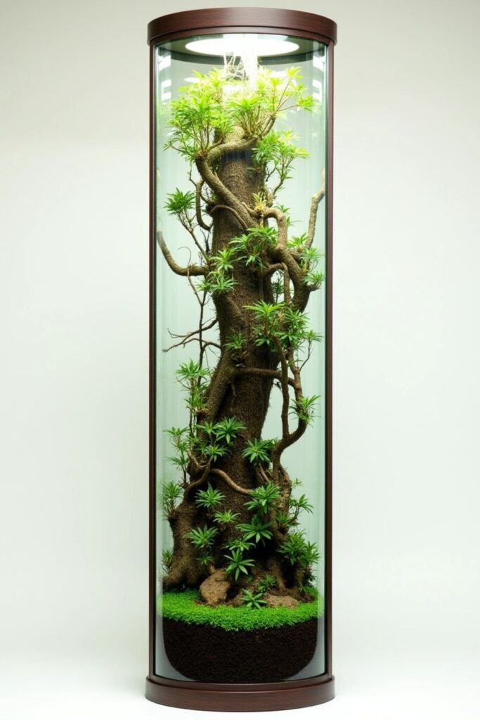 Use a tall cylindrical tank to create this vertical paradise. Decorate with vibrant miniature trees, moss, and lush greenery to mimic a thriving forest.