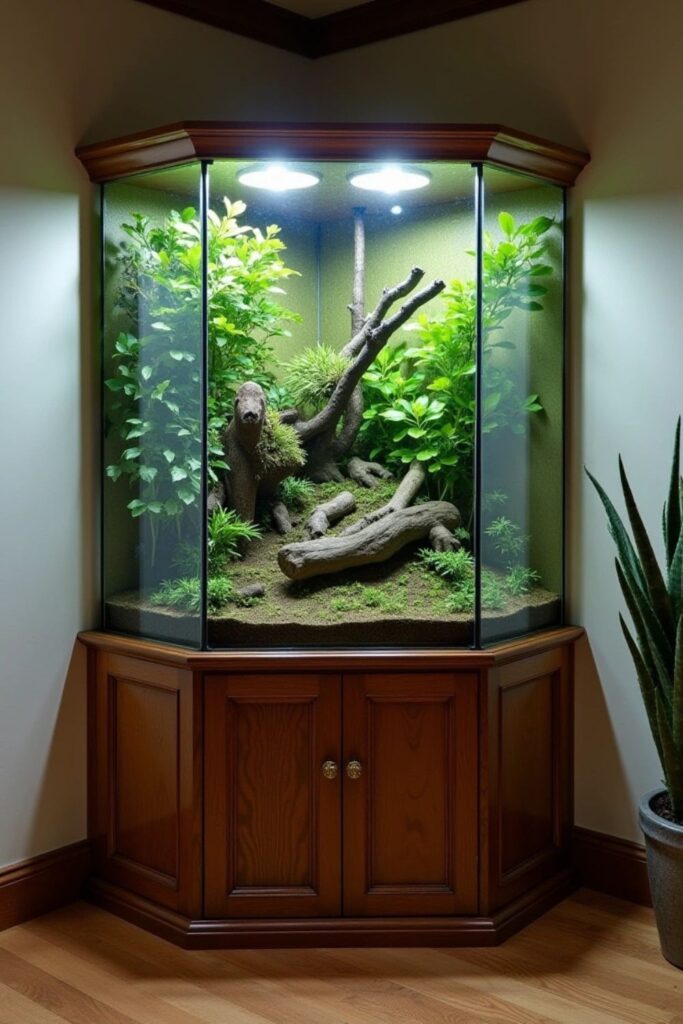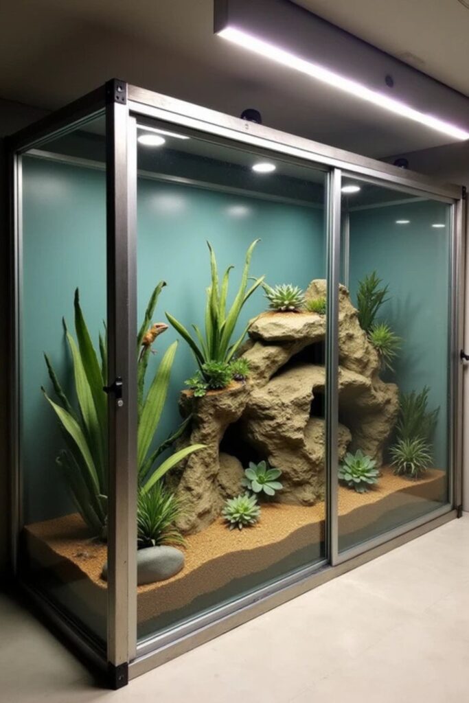 Add overhead LED lighting to highlight the scene and ensure warmth. This setup not only cares for reptiles but also brings natural beauty into modern interiors.