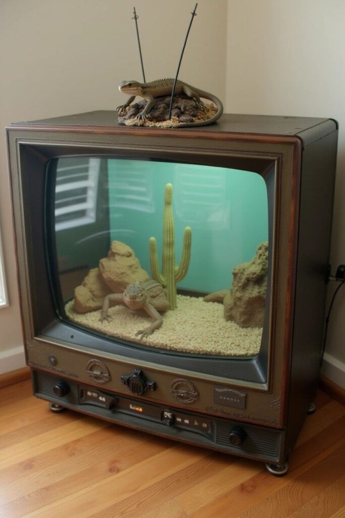 The quirky Retro TV Desert repurposes an old TV into a unique reptile habitat. Create an arid landscape using sand substrate and sculptural rock formations.