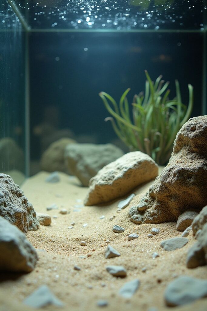 Transform your aquarium into a desert-inspired haven with sandy substrate, scattered large rocks, and sparse vegetation.