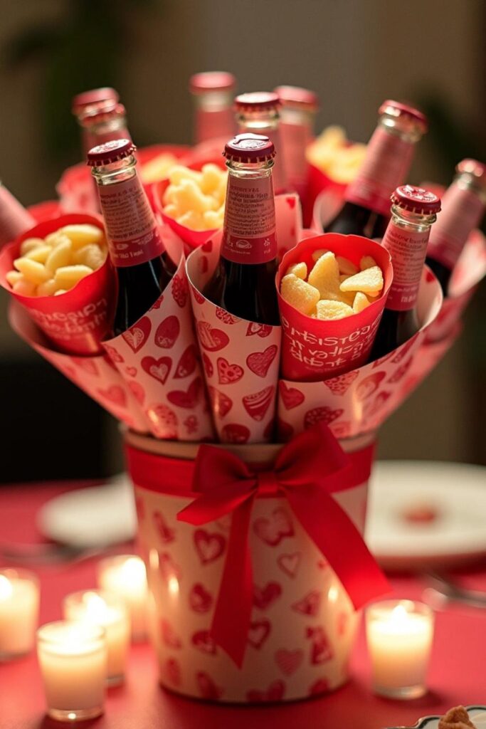 Arrange them in a foam base or decorative bucket, stabilizing with extra tape if needed. Add small snacks, chips, or candies between the bottles for variety. Wrap it all in cellophane or colorful tissue, tied with a bold ribbon.