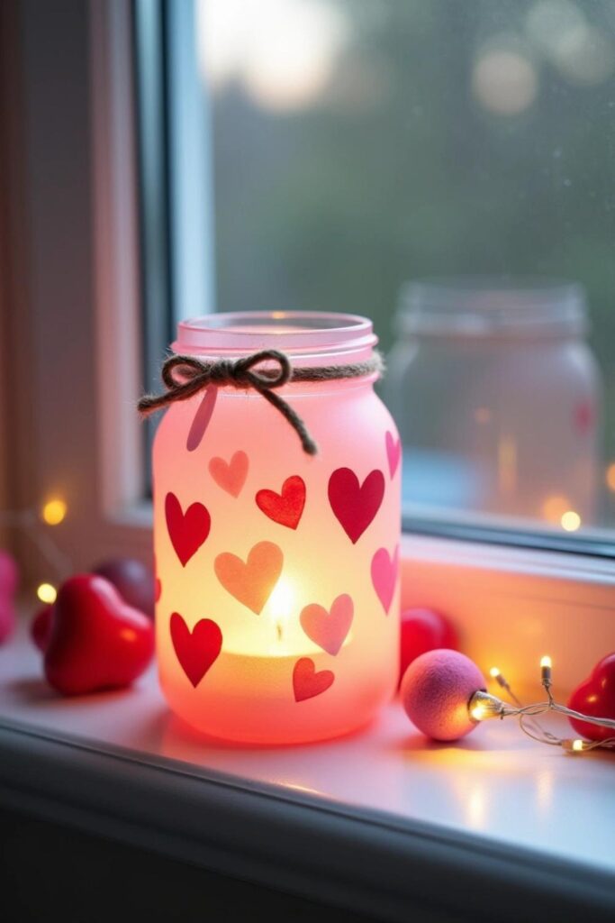 Get creative by adding hearts, glitter, or lace, then tie a lovely ribbon around the jar’s neck. For a special touch, carve out a heart-shaped design so light can peek through.