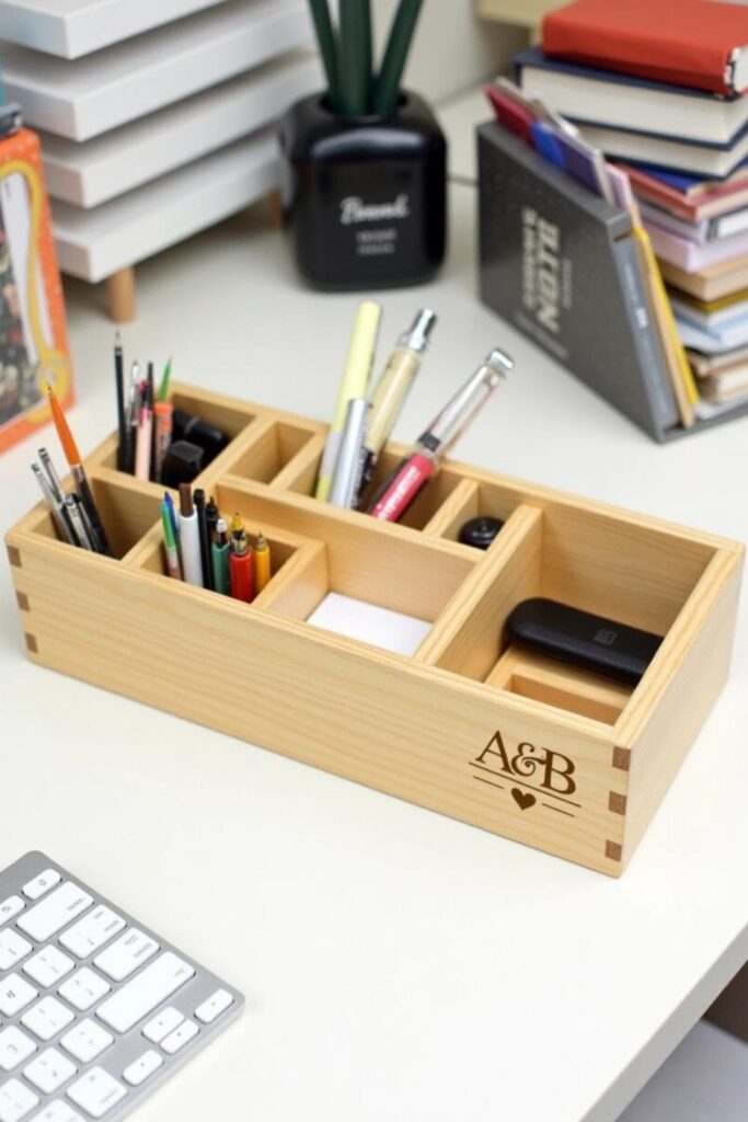 Build a custom desk organizer that’s useful and heartfelt. Use wood or acrylic to create compartments for pens, notes, and gadgets.