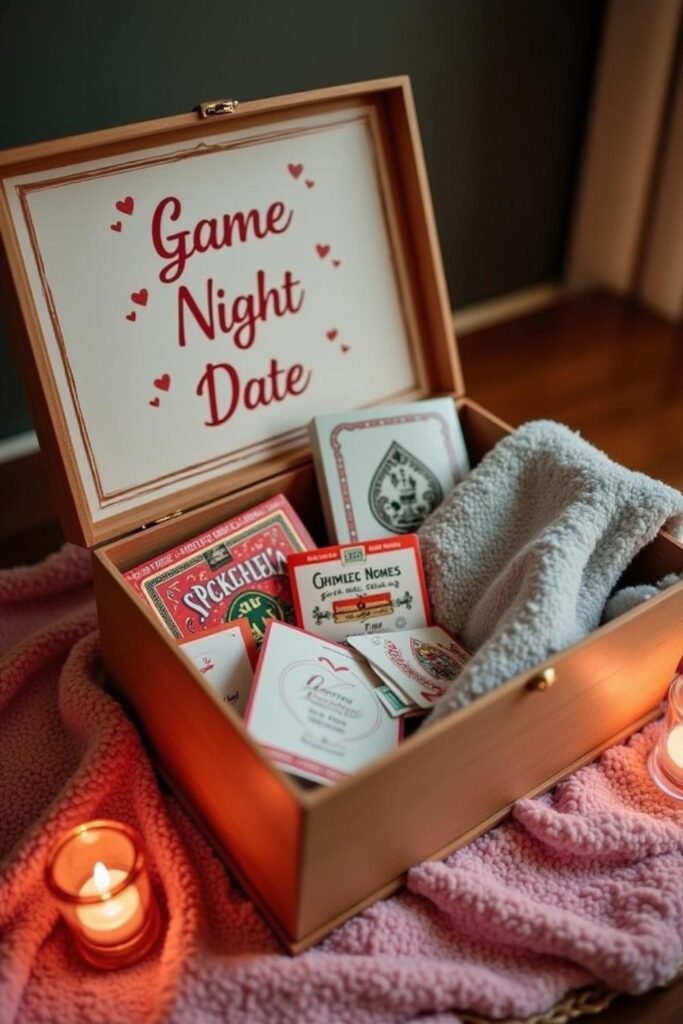 Include a handwritten invitation for a fun-filled night, with ideas like “Winner gets a kiss!” Arrange everything neatly in a decorative box or basket for a polished look.