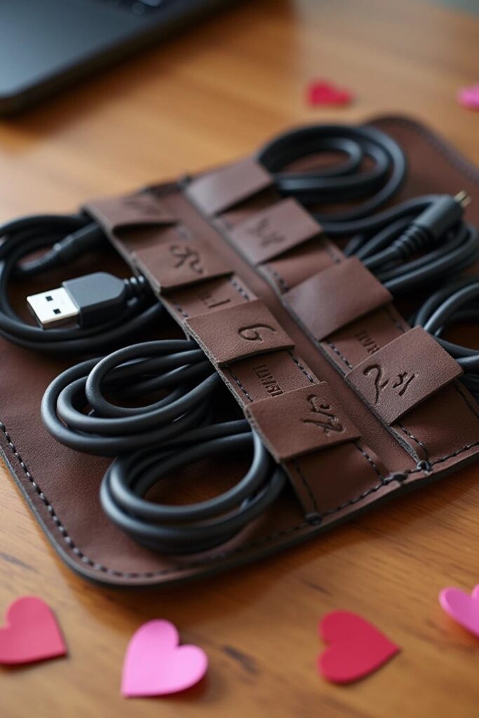 A leather cord organizer is perfect for taming tangled chargers and cables. Cut a rectangular piece of leather, ensuring it feels smooth and durable. Add precise slots or holes to hold cords snugly.