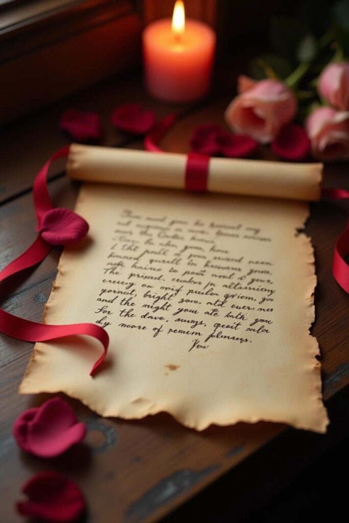 Write from the heart share why you love him, your favorite moments, and dreams for the future. Roll it into a scroll, tie it with a ribbon, and seal it with wax for a magical touch.