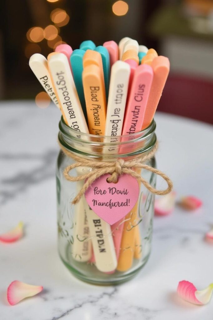 Add an instruction tag like “Pick one when we need a plan.” This creative jar ensures fun, spontaneous moments while keeping your time together unique and adventurous.