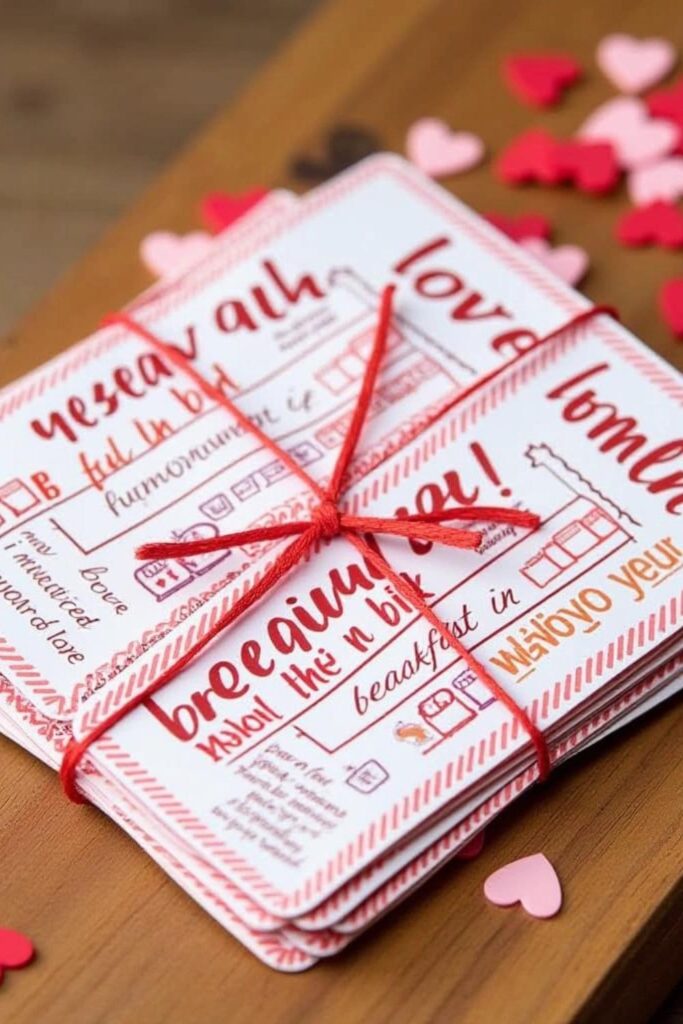 Create a fun and meaningful gift with a love coupon book. Use colorful card stock or blank cards to write “redeemable favors” like “Breakfast in Bed” or “A Movie Night of Your Choice.”