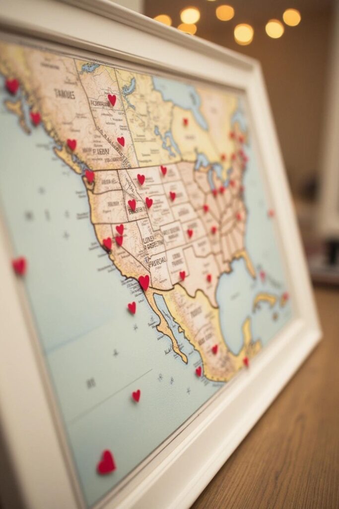 Add stickers, pushpins, or hearts to mark these spots, and label them with captions like “First Kiss.” Decorate the map with photos, quotes, or a title like “Our Love Journey” and frame it for a polished finish.