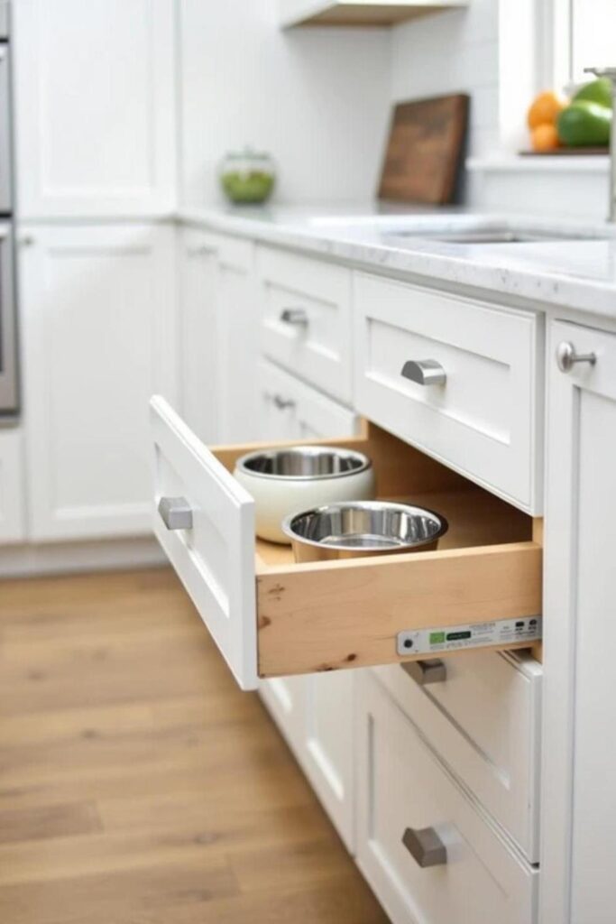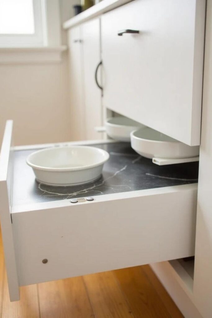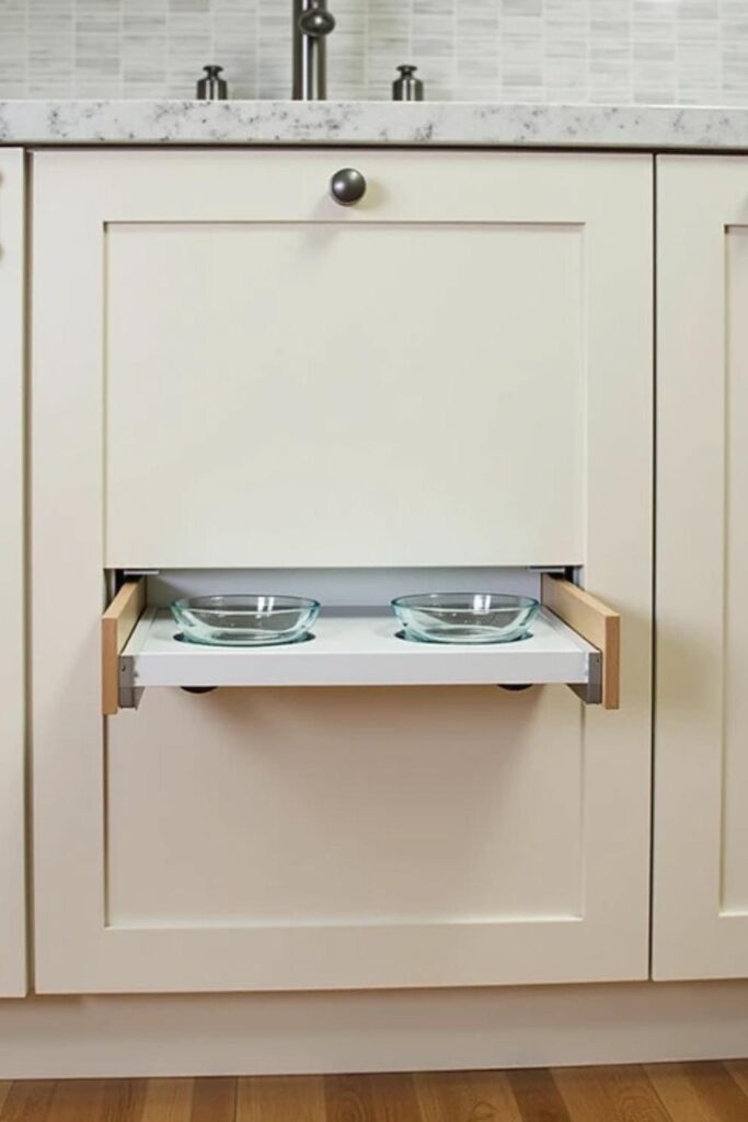 Revamp your kitchen cabinetry with a pull-out drawer design that seamlessly integrates hidden pet bowls into your space.