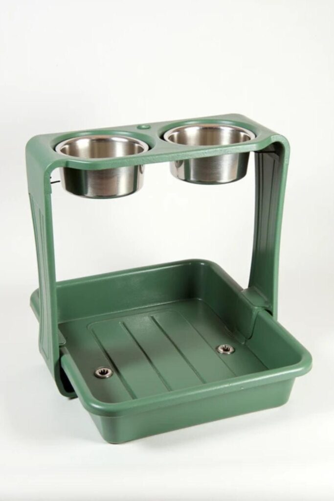 The Portable Tray Stand is an innovative, mobile solution for pet feeding, featuring a sturdy green frame with an integrated handle for easy carrying.