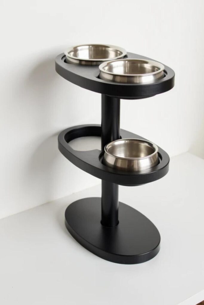 Its black, glossy finish and circular swivel design allow easy access to three stainless steel bowls at varying heights, perfect for homes with multiple pets.