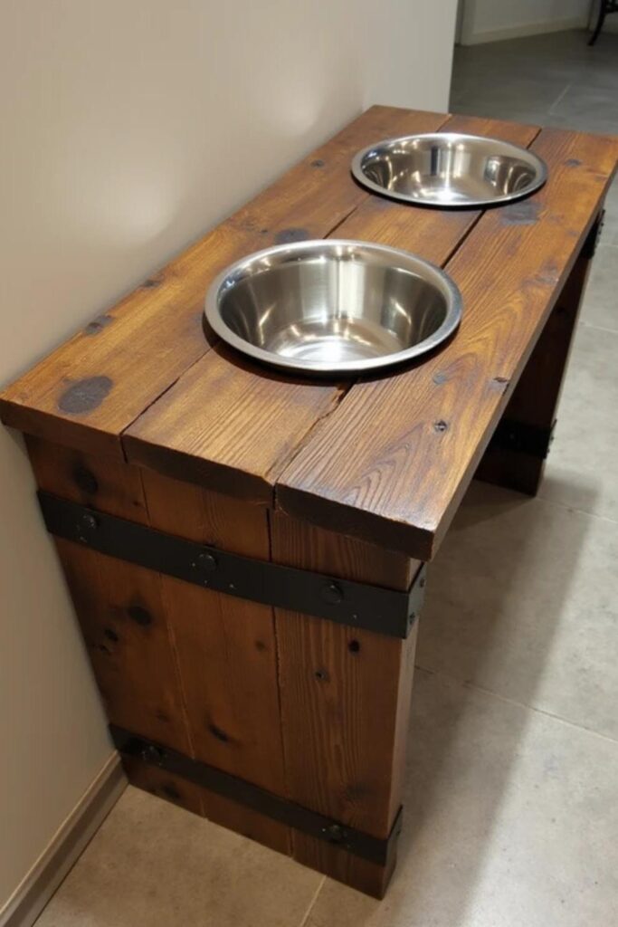 Create a statement-worthy feeding station by pairing a robust, textured wood plank with black metal straps for a bold industrial look.