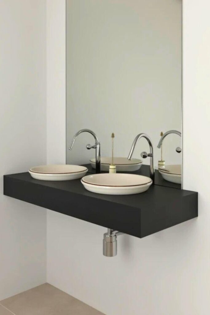 Install two stylish ceramic bowls into the shelf for a clean and chic setup.