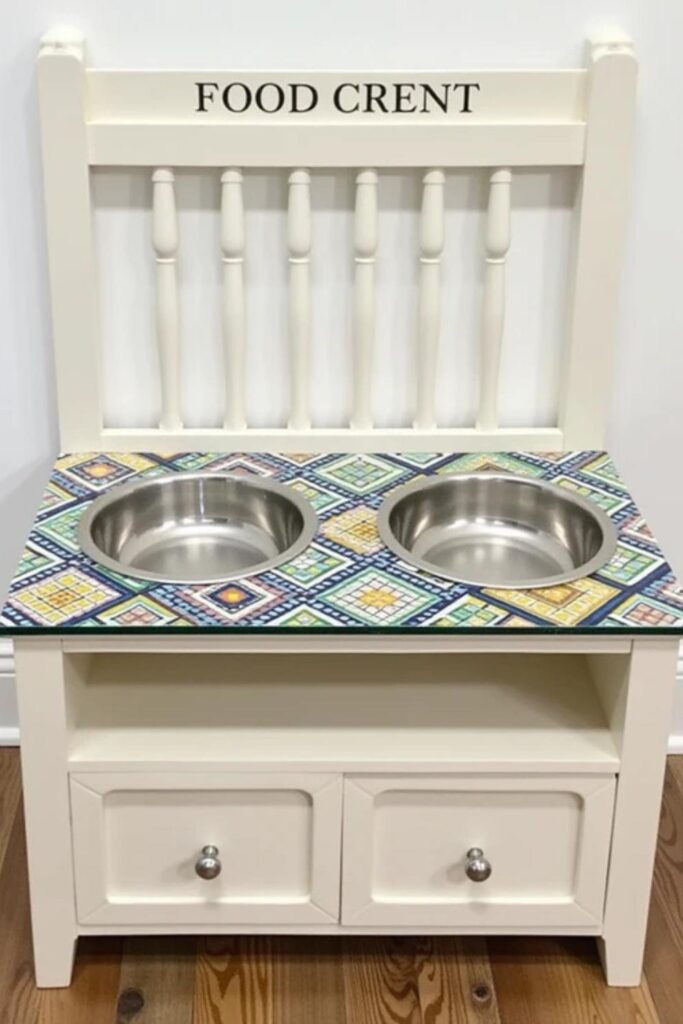 Add vintage charm to your pet’s dining area using a whimsical chair-back design combined with a patterned countertop featuring integrated bowls.
