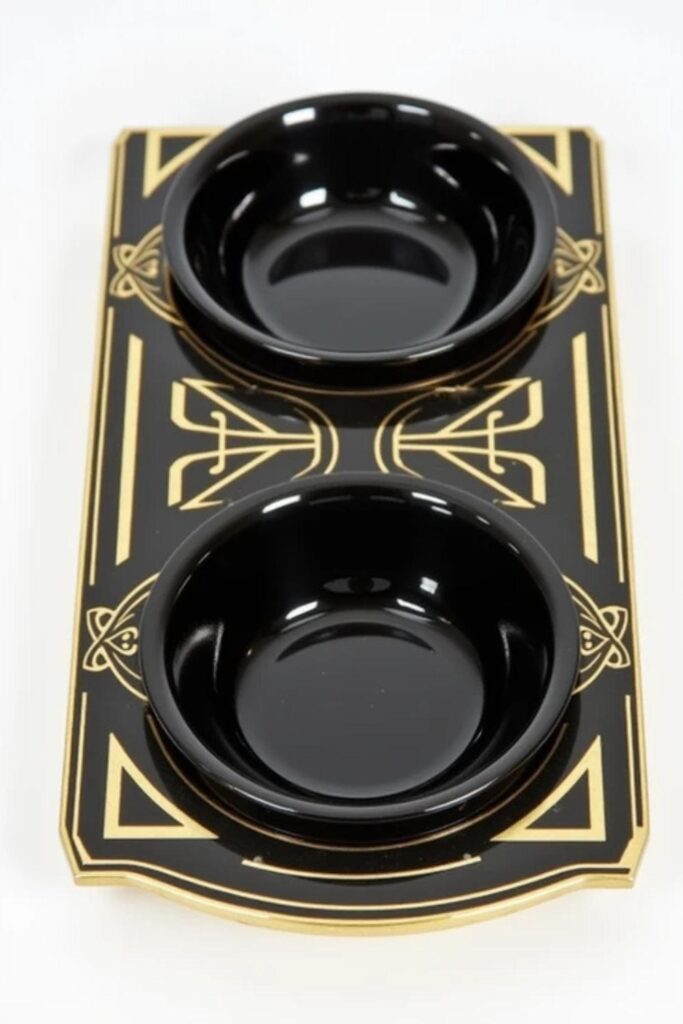 Bring sophistication to your pet’s feeding station with a sleek black tray accented by ornate gold details.