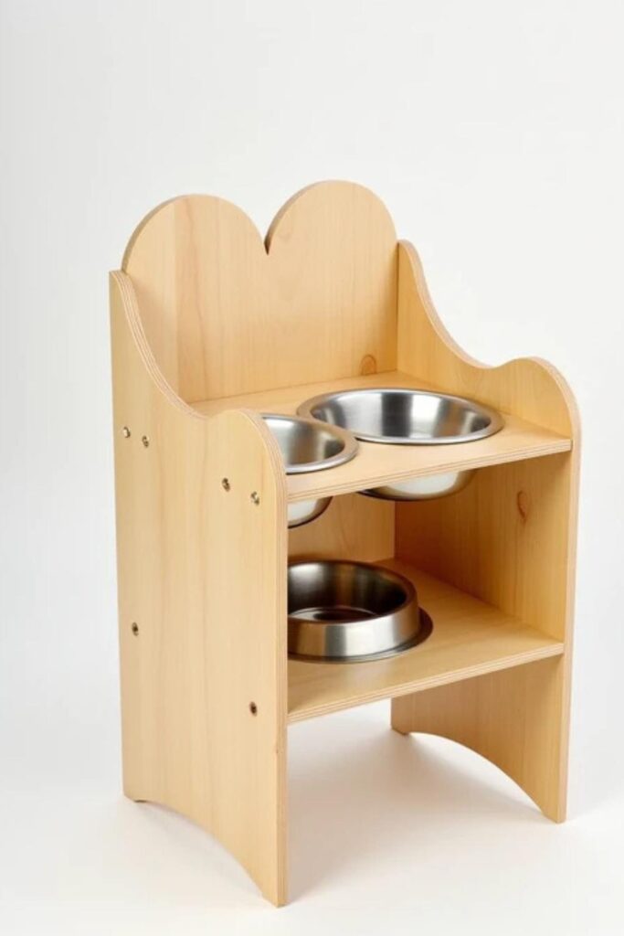 The Heart Chair Feeder is a charming addition to any pet-friendly home, designed with a whimsical heart-shaped back and soft, natural wood.