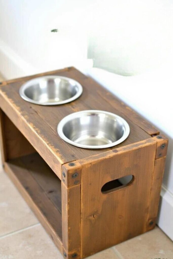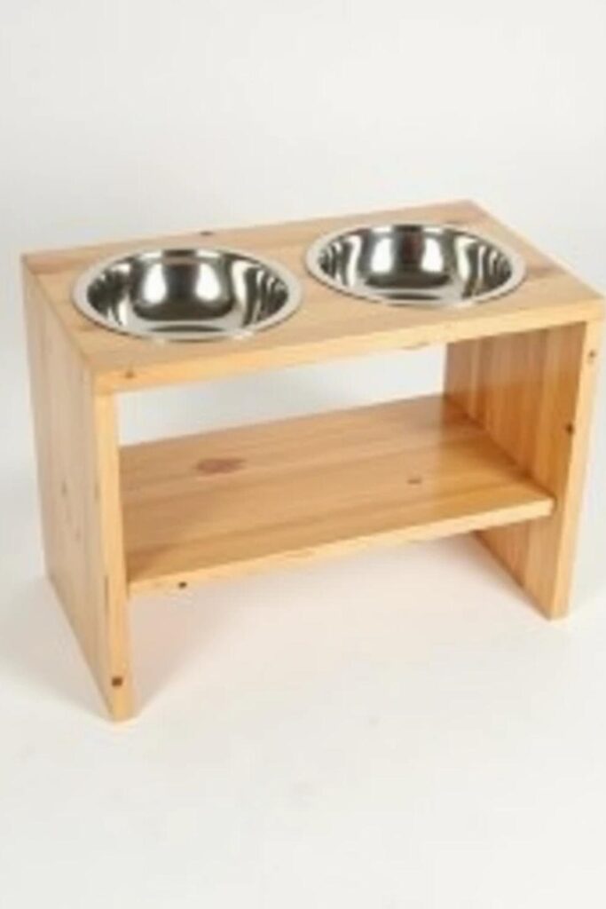 Transform natural pine into an elegant elevated dog feeder by crafting a sturdy frame with two snug stainless steel bowls set into circular cutouts.