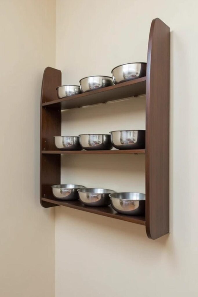 Maximize space with this neat feeding shelf. Mount a mahogany shelf on the wall, fitted with several stainless steel bowls for organized multi-pet feeding.