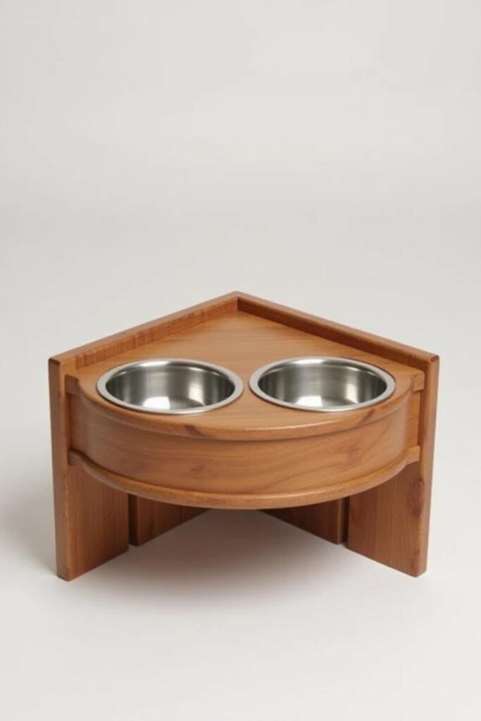 Create a classic feeding station that fits snugly into any corner of your home. Use polished cedar wood, shaped with smooth contours to hold two stainless steel bowls securely.