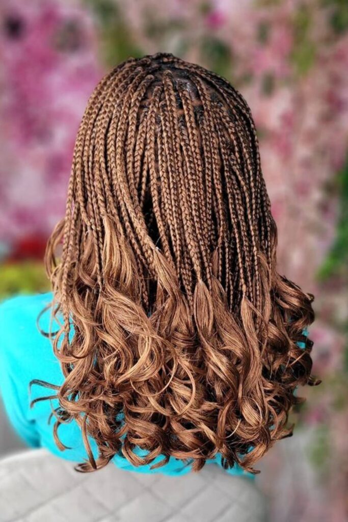To recreate this look, braid your hair in medium-sized box braids, leaving part of the ends for curling. Practical for everyday wear, this medium length delivers a youthful, playful vibe.