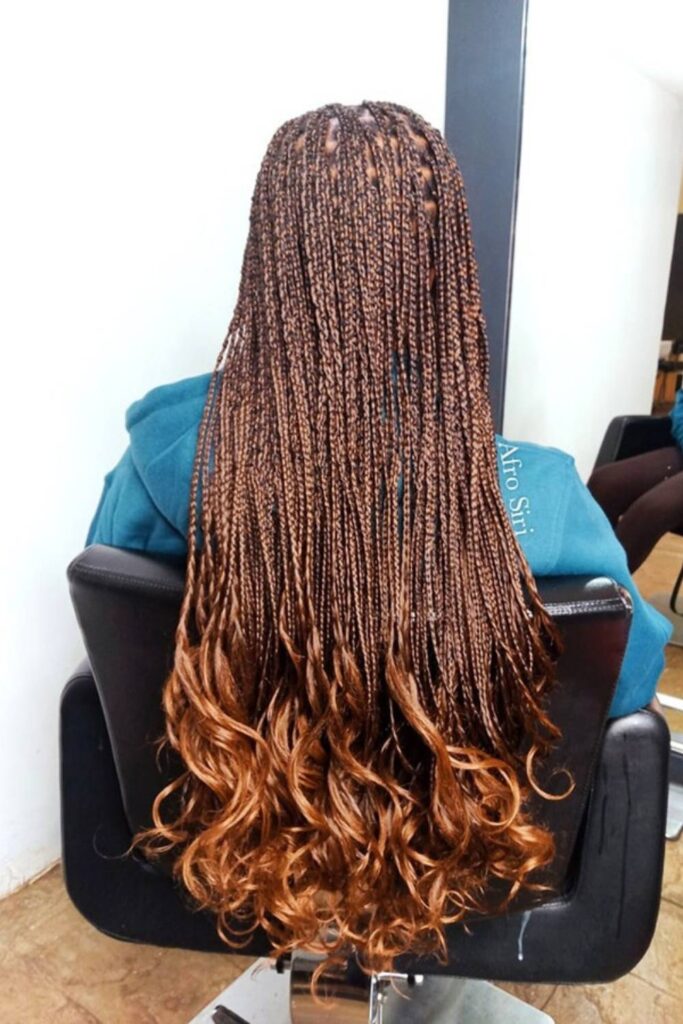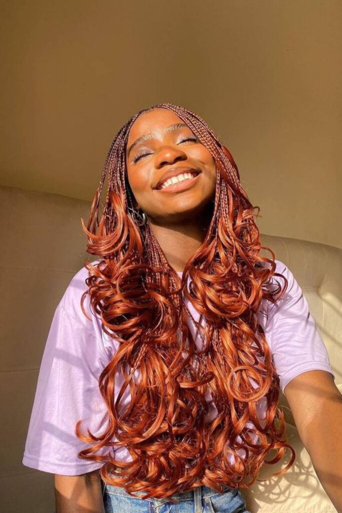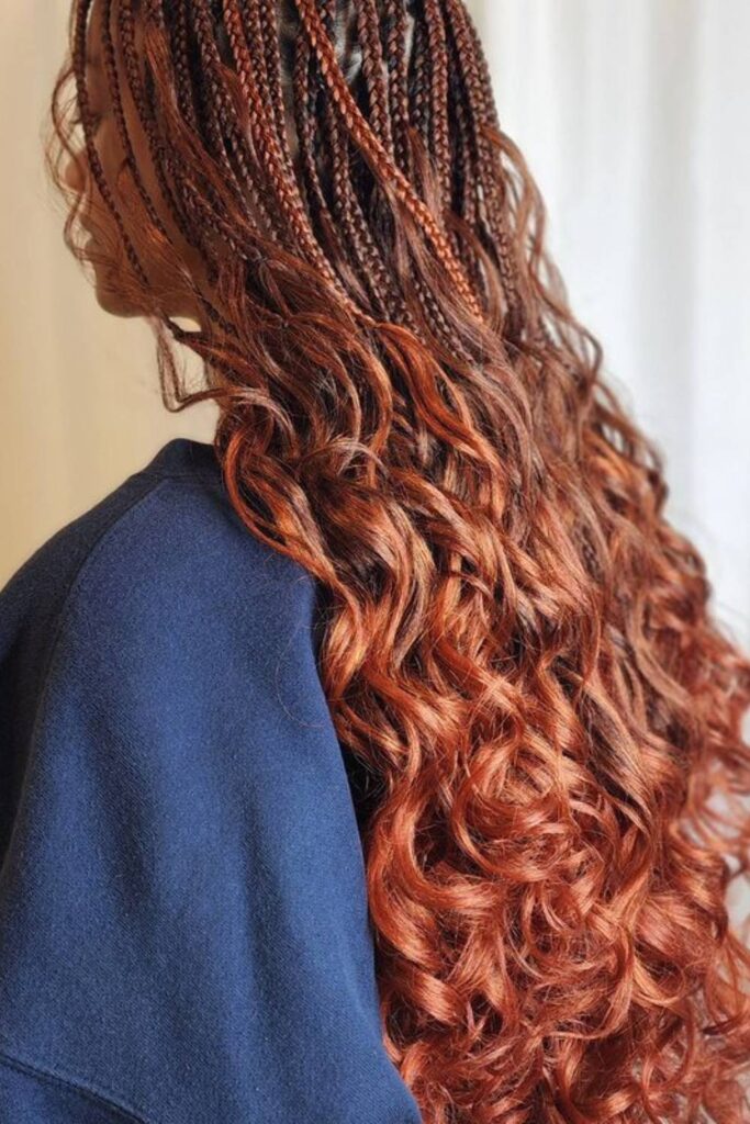 Opt for a bold and warm-toned style with copper French curl braids. The coppery-red braids cascade into soft, voluminous curls, crafting a vibrant look.