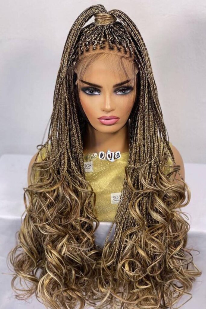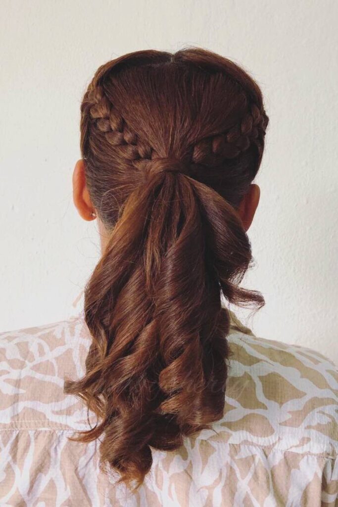 To achieve this look, braid the top section into thin braids and secure them into a ponytail. Leave the rest loose and curl with a curling wand or extensions.