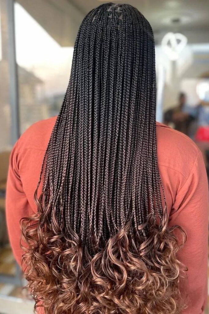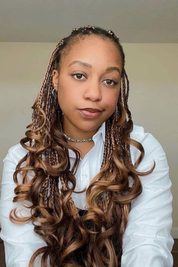 To craft this look, part your hair centrally and braid the top sections in classic box braids, leaving the ends to curl naturally. Enhance the curls with a light mousse for extra bounce.
