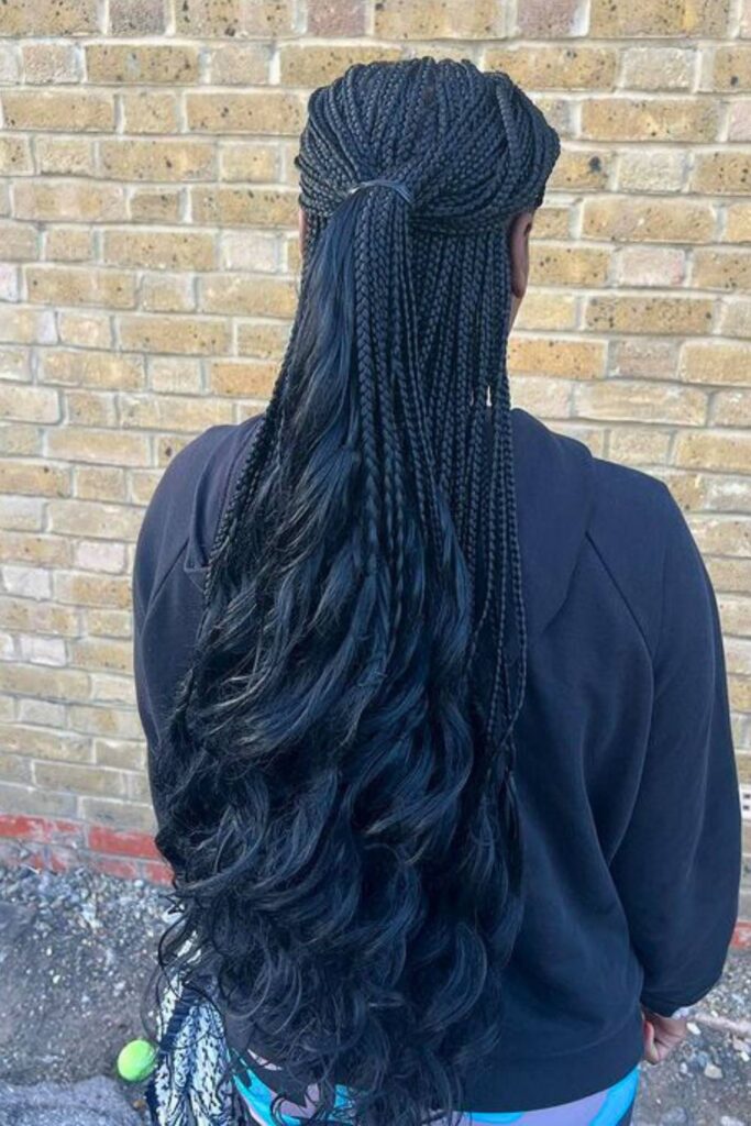 To achieve this look, braid the top half and secure it in a ponytail, allowing the remaining braids to transition into loose curls.