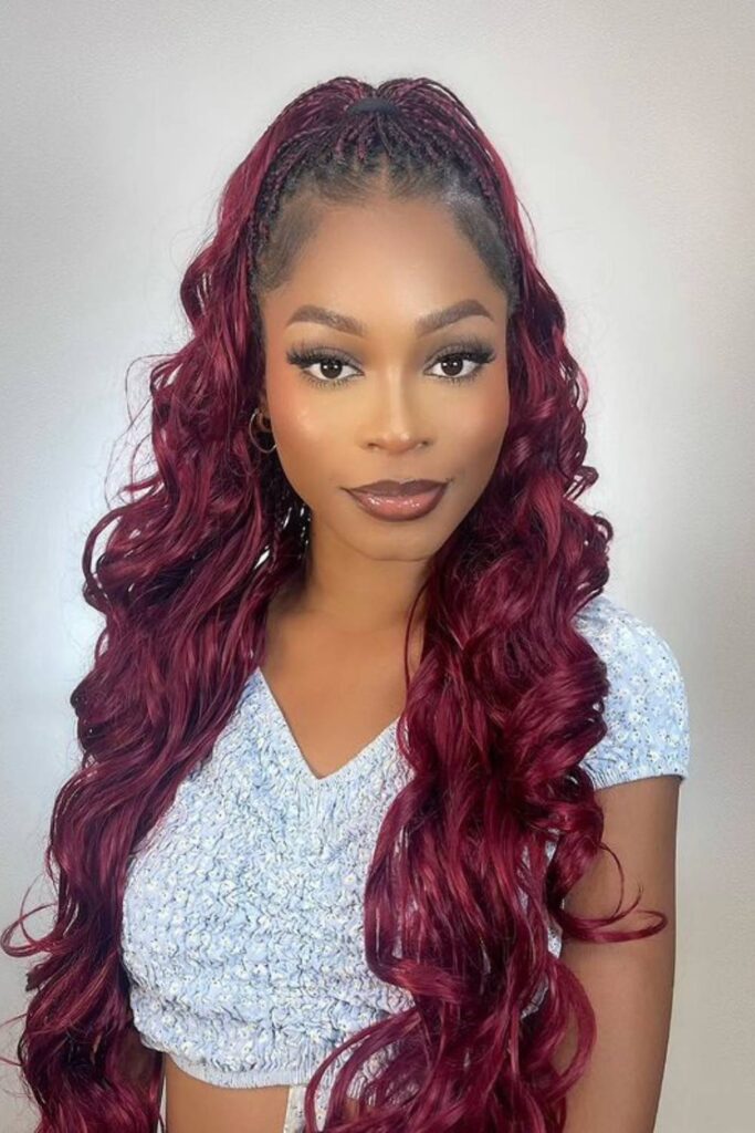 Make a bold statement with burgundy French curl braids. The braids flow into long, loose curls in a rich burgundy shade, creating a striking contrast.