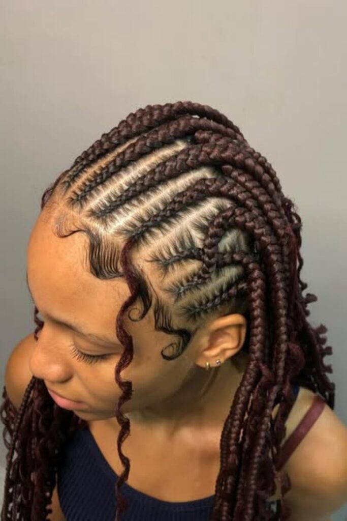 The symmetrical cornrows highlight intricate craftsmanship, while burgundy tones add depth and vibrance. Low-maintenance yet eye-catching, this hairstyle combines structure with softness.