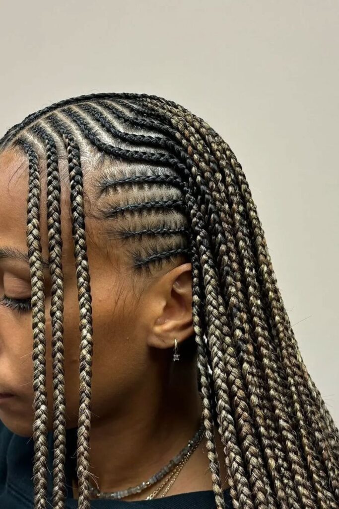 A contrasting blonde braid weaves through the crisp cornrow designs, adding a creative edge.