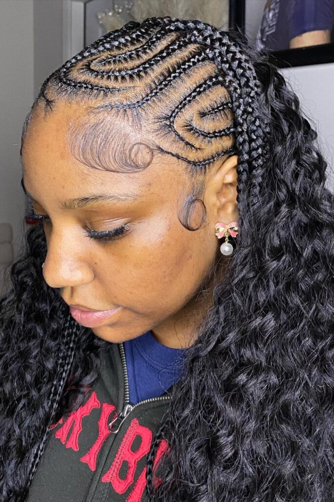 Combine sleek cornrows on the crown with bouncy, flowing curls cascading down for a stunning contrast.