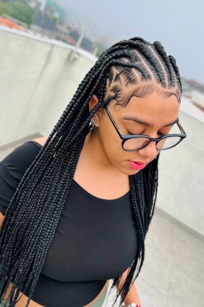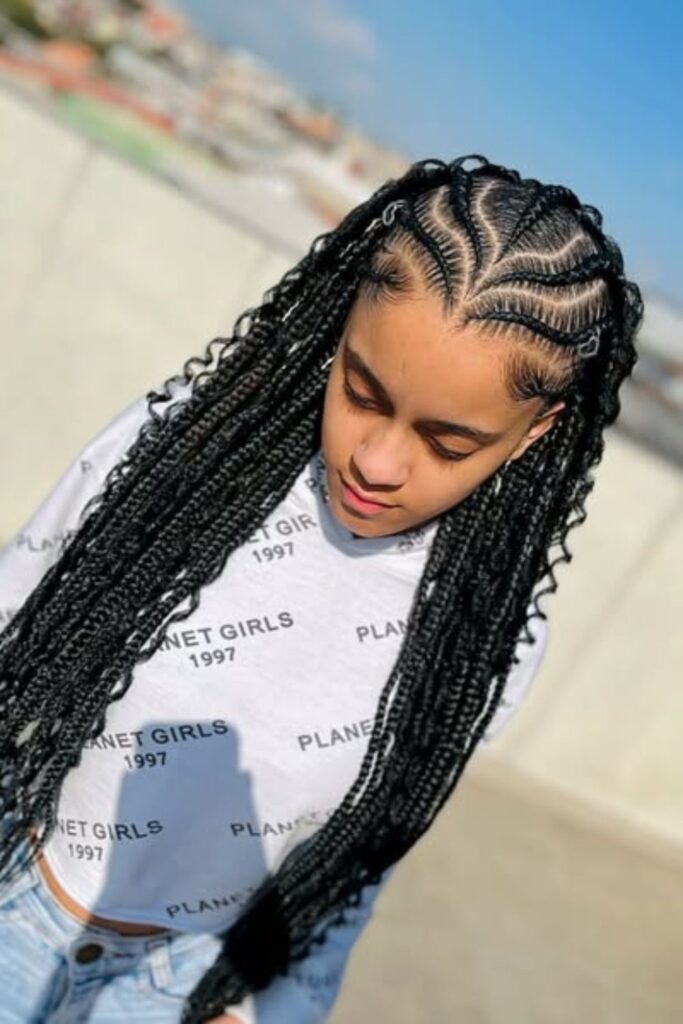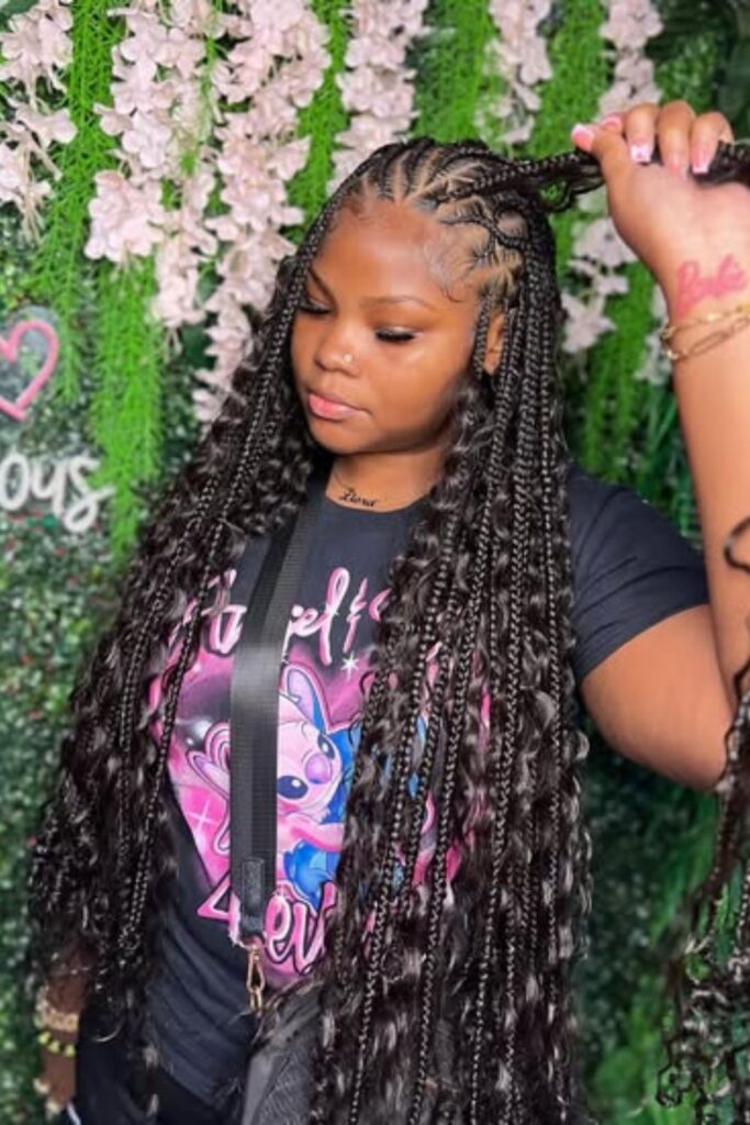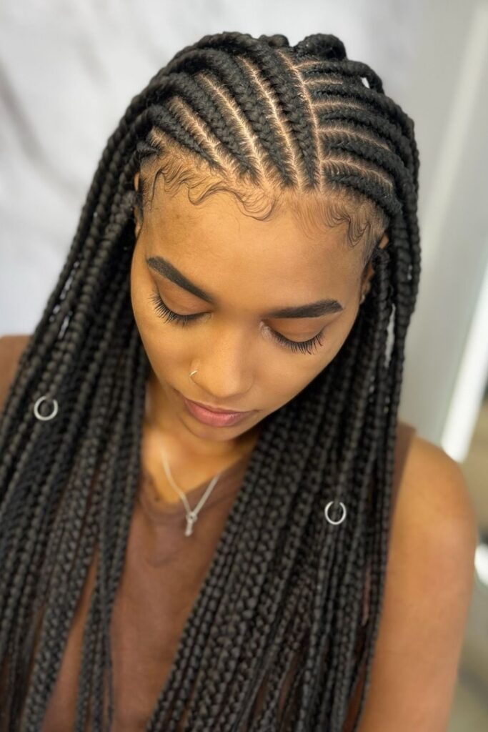 This look features sleek cornrows transitioning into loose braids, creating depth and drama. The style works beautifully for both casual and formal occasions, offering versatility and elegance.