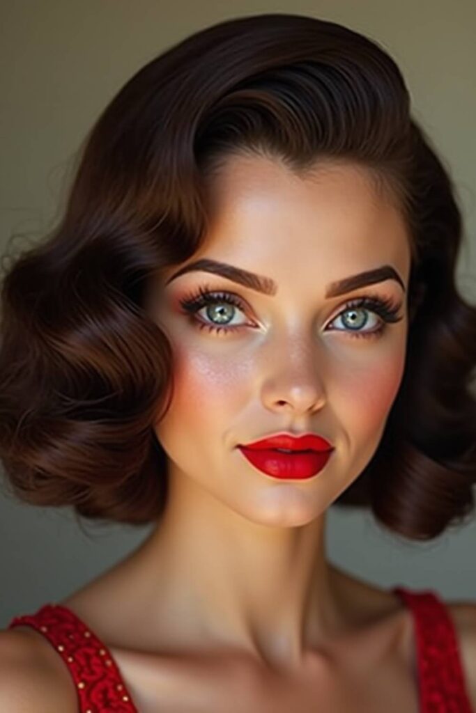 These waves are shaped to create a uniform, vintage pattern, complemented by a bold red lip, exuding confidence and femininity.