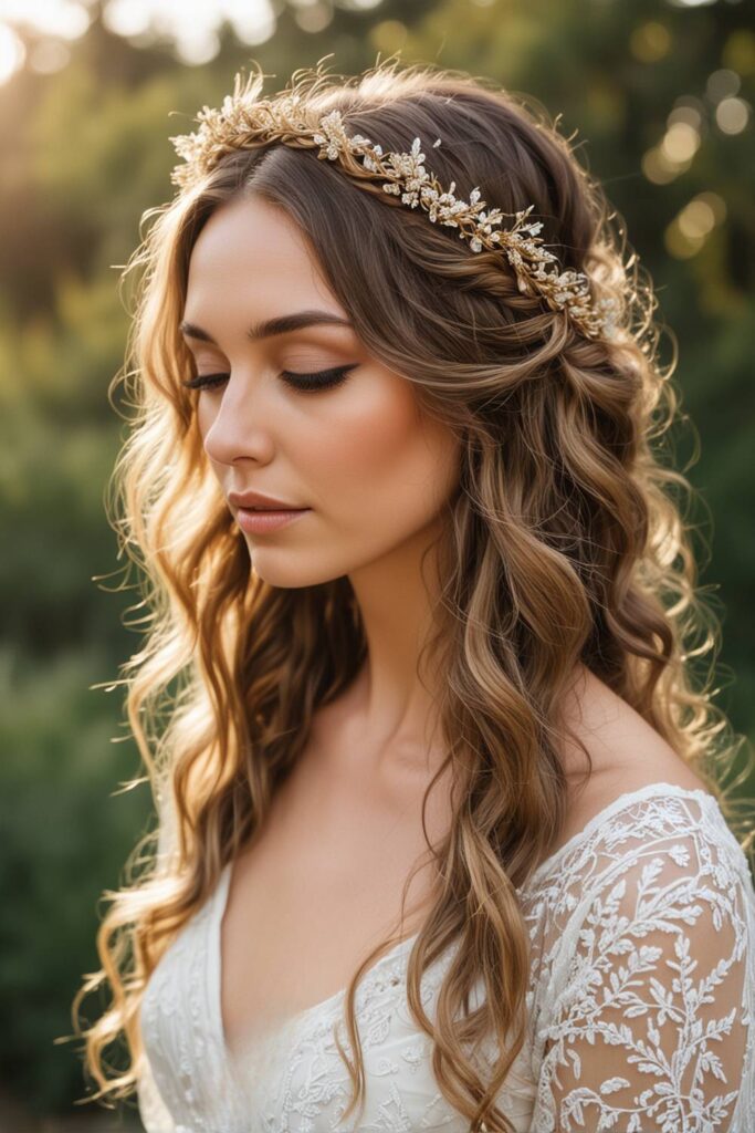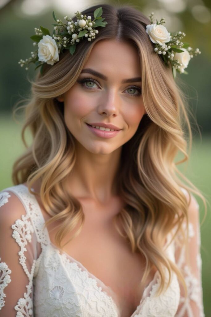 This style is perfect for rustic or boho-themed weddings, adding a touch of whimsy and charm to the bridal look.