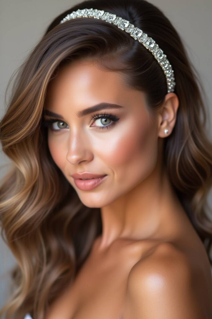 Adorn your hair with a sparkling crystal headband across the crown, adding a hint of sparkle and elegance.