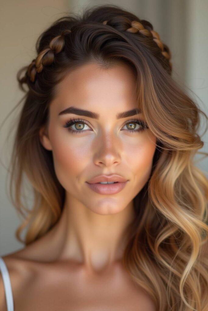 For a whimsical twist on traditional waves, try Boho Glam Waves with a Braided Crown. Style soft, loose curls with a curling wand for an ethereal feel. Add a delicate braid across the crown to serve as a natural headband, enhancing the bohemian aesthetic.