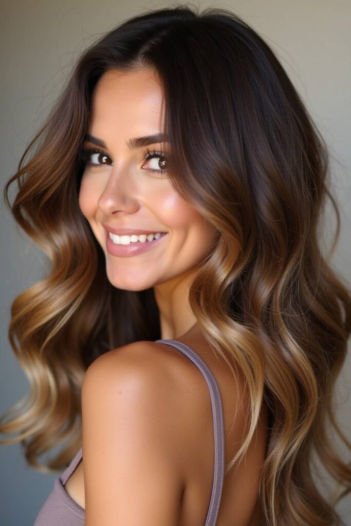 Achieve relaxed glamour with Tousled Glam Waves by crafting voluminous, carefree waves. Start by using a curling wand to create loose, beachy waves. To add lift, gently tease the roots.