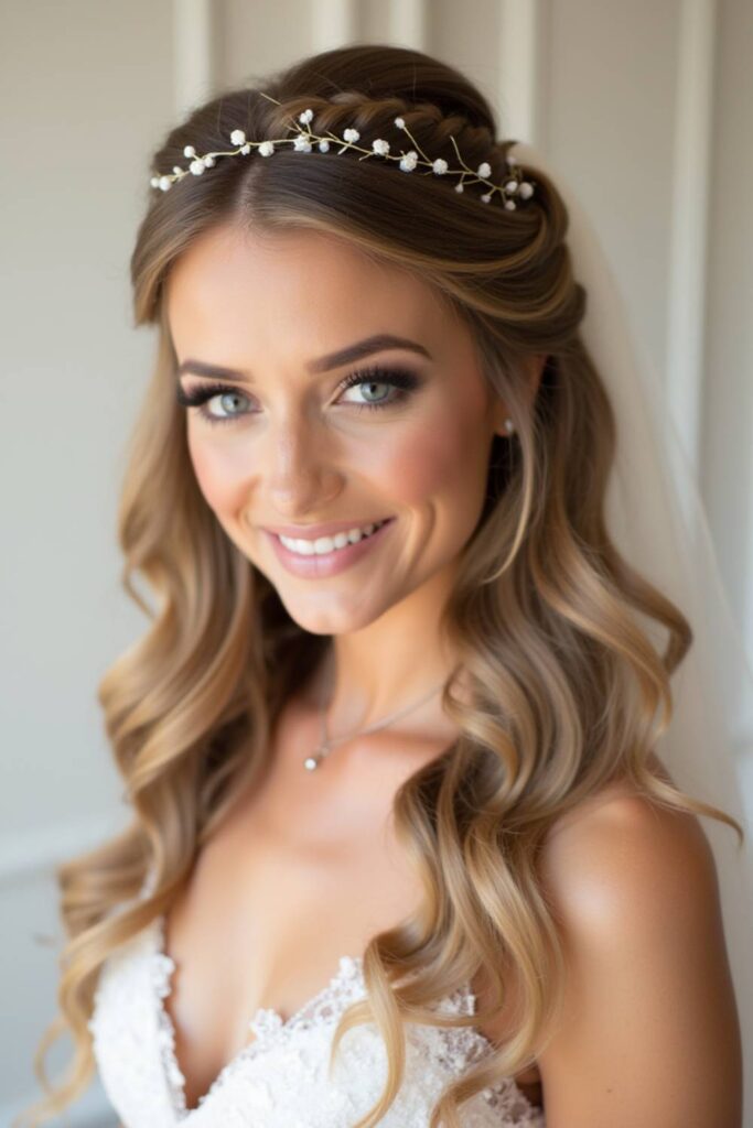 For brides who want a mix of elegance and ease, Glam Waves in a Half-Up Style is the way to go. This look involves pulling back the top half of your hair, leaving the rest as soft waves that fall down your back.