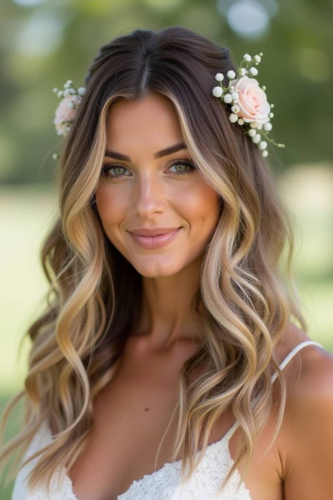 Use a large-barrel curling iron to form gentle waves, adding small floral pins like baby’s breath for a natural vibe. Perfect for bohemian, garden, or beach weddings, this style echoes natural elements.