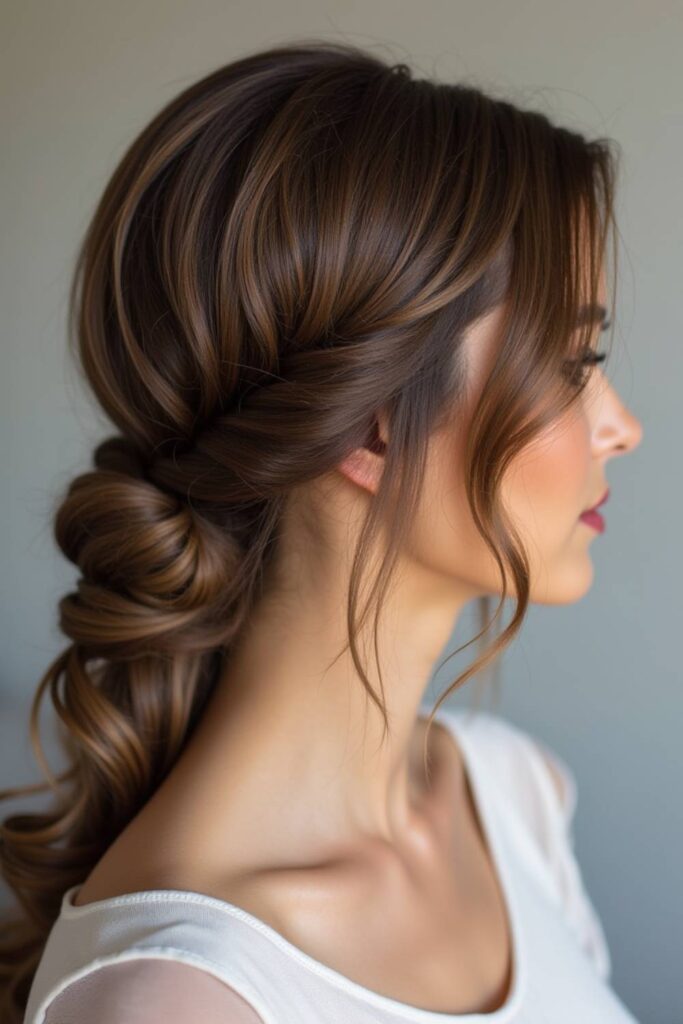 Begin with glamorous Hollywood waves styled to one side. Gather these into a low-side bun for added sophistication and control.